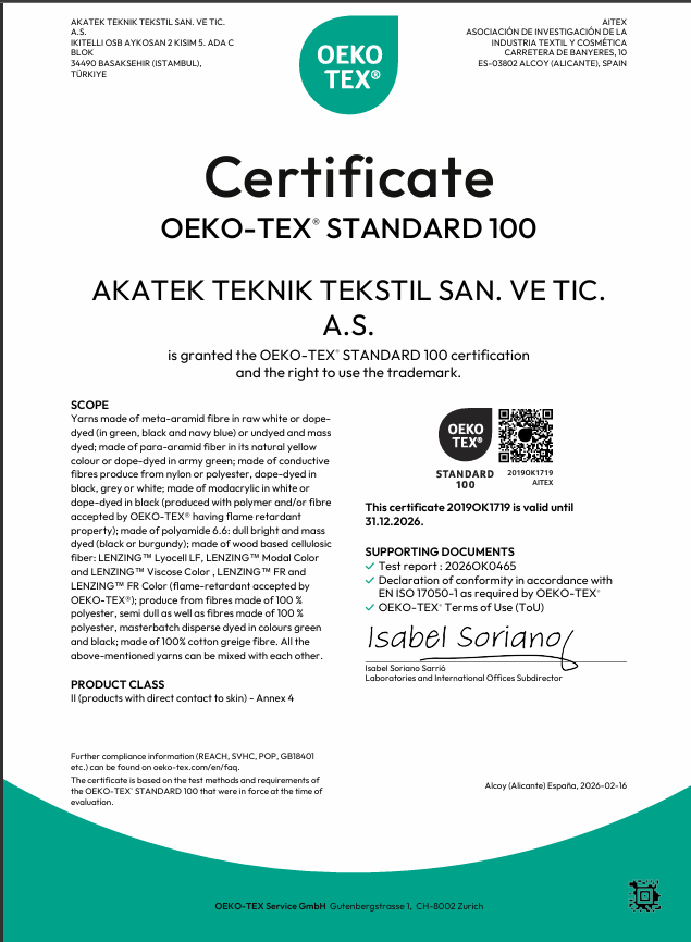 AKATEK holds certifications including ISO 9001, ISO 14001, ISO 45001, Global Recycled Standard (GRS), Recycled Claim Standard (RCS), and Organic Content Standard (OCS). In addition, our yarns and fabrics are certified according to OEKO-TEX STANDARD 100.